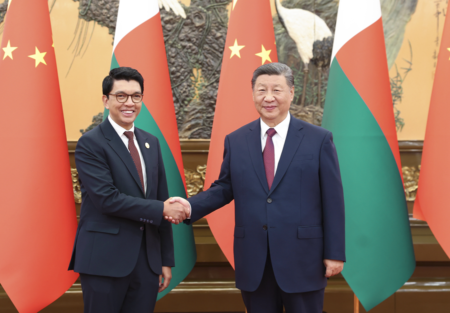 習近平指出,中馬之間雖然遠隔重洋,但兩國人民相知相親。建交52年來,雙方始終堅持真誠友好、平等相待、互利共贏。特別是近年來,兩國秉持建交初心,不斷加強政治互信,深化各領域合作,兩國人民的獲得感日益增強。中方支持馬達加斯加獨立自主探索符合本國國情的現代化道路,願同馬方加強交流合作,拓寬務實合作,繼續實施好雜交水稻技術援助項目,探討加強礦業、新能源、藍色經濟、防災減災等領域合作。中方支持魯班工坊、孔子學院在馬達加斯加發展,助力馬方培養更多現代化高素質人才。加強青年、文化、地方等人文交流,不斷夯實兩國友好民意基礎。
