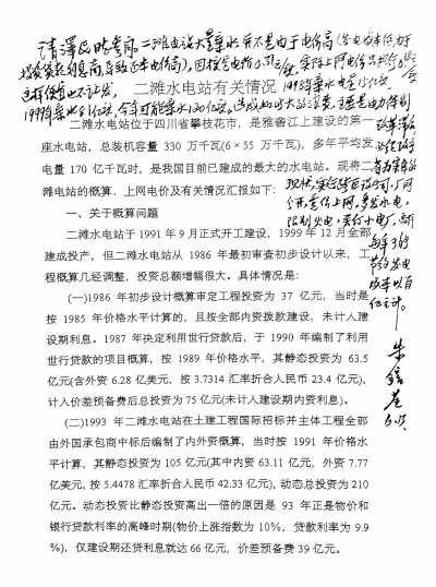 時任國務院總理朱鎔基在《二灘水電站有關情況》上作出的批示。摘自《朱鎔基講話實錄》