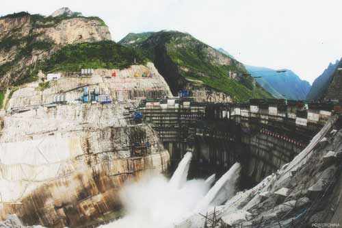 錦屏一級電站位於四川省涼山彝族自治州木裏縣和鹽源縣交界處雅礱江大河灣幹流河段,是雅礱江下遊從卡拉至河口河段水電規劃梯級開發的龍頭水庫,該水電站為混凝土雙曲拱壩,壩頂高程1885米。右岸地下電站總裝機容量360萬千瓦 ( 6台x 60萬千瓦 ),枯水年枯期平均出力108.6萬千瓦,多年平均年發電量166.2億千瓦時。水庫正常蓄水位1880米,總庫容77.65億立方米,樞紐建築由擋水、泄水及消能、引水發電等永久建築物組成,為世界第一高雙曲拱壩。按照計劃,建設總工期9年3個月,工程靜態總投資182.9億元。