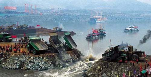 2002年10月21日,三峽大壩最關鍵的泄洪壩段已經全部建成,全線達到海拔185m大壩設計高程;2002年10月26日,全長1.6km的三峽二期大壩全線封頂,整段大壩都已升高到海拔185m設計壩頂高程【圖為】2010年12月1日,大型工程機械對三峽地下電站圍堰進行拆除。