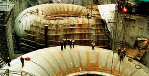 三峽水電站的機組布置在大壩的後側,共安裝32台70萬kW水輪發電機組,其中左岸14台,右岸12台,地下6台,另外還有2台5萬kW的電源機組,總裝機容量2250萬kW,設計年發電量約1000億kWh。機組設備主要由德國福伊特(VOITH)公司、美國通用電氣(GE)公司、德國西門子(SIEMENS)公司組成的VGS聯營體和法國阿爾斯通(ALSTOM)公司、瑞士ABB公司組成的ALSTOM聯營體提供。它們在簽訂供貨協議時,都已承諾將相關技術無償轉讓給中國國內的電機製造企業【圖為】三峽水利樞紐工程地下廠房施工場景。
