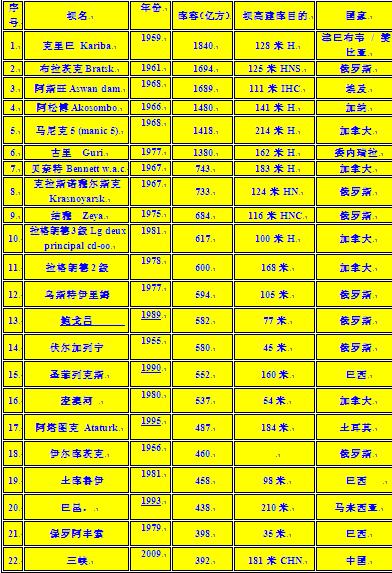 世界已建成的大水庫(中國的三峽排在第22位)