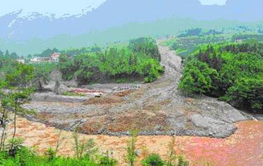 虹口滑坡的大量泥石流衝入河道(圖片來源:四川新聞網)