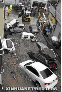 7月16日,韓國釜山暴雨引發泥石流,一些車輛被沙石掩埋(圖片來源:新華網)