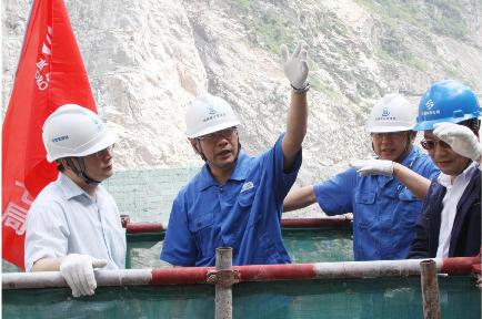 二灘水電開發有限責任公司總經理陳雲華(左二)在錦屏一級水電站工地現場辦公