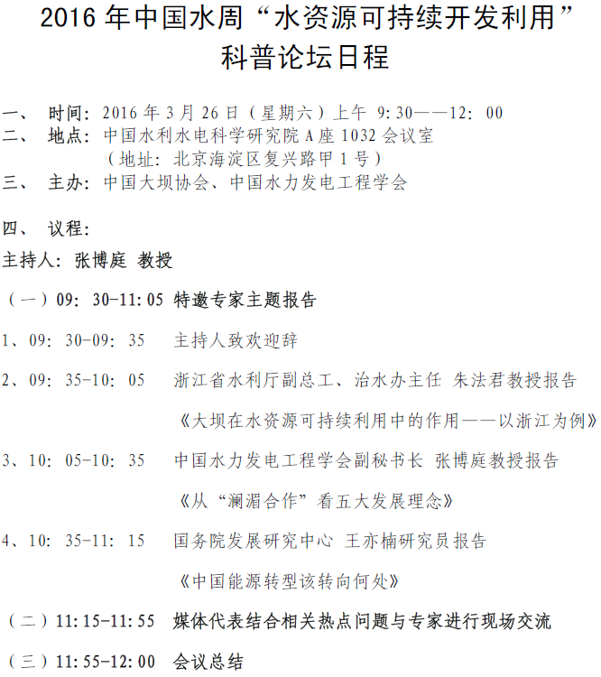 2016中國水周"水資源可持續開發利用"科普論壇議程