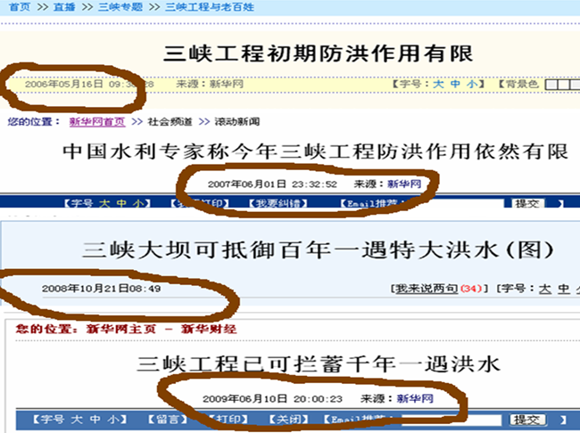 例如,2006年5月16日,三峽水庫二期蓄水前,新華社的記者(張先國)就報道某水利官員說《三峽工程的初期防洪作用有限》。2007年6月1日還曾有新華社(記者楊希偉)報道說"湖北省水利廳廳長王忠法1日在湖北防汛形勢座談會上表示,對三峽工程今年的防洪作用不能估計過高,中下遊地區對長江防汛絕不可麻痹鬆懈。"