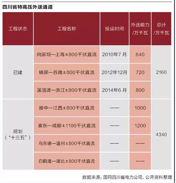 四川電網通過三大特高壓直流線路與華東電網相連,外送市場覆蓋江蘇、浙江、上海、安徽四省。不過,由於上述送出通道均為幾大電站的配套建設,並無能力外送四川其他電站的富餘電力。