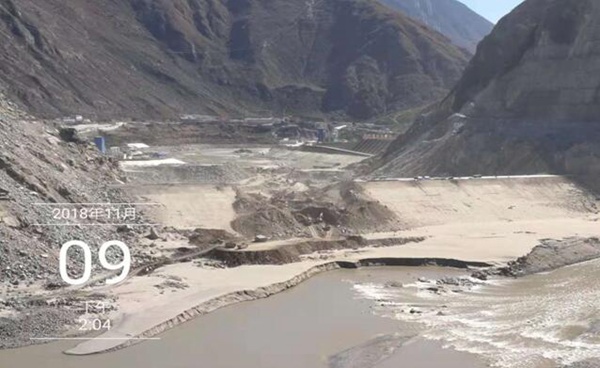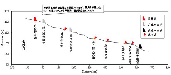 11月12日淩晨,泄流槽開始進水,10點50分開始過流;13日8時前後泄流槽過流流量明顯增大,13日12時衝刷明顯加快;13日14時過流流量超過堰塞湖入湖流量,堰塞湖壩前最高水位2956.40m,相應庫容5.78億m3;13日18時出庫最大流量30000m3/s左右;14日8時退至基流。
