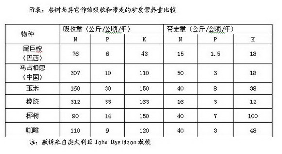 上表說明,桉樹無論是吸收還是帶走的礦質營養量,較其他作物物相比都不是最多的。因此說,桉樹會導致嚴重的土壤退化是沒有科學依據的。