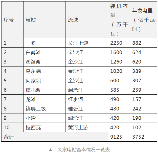 截至2019年底,在我國排名前十的已、在建水電工程分別是三峽工程、白鶴灘水電站、溪洛渡水電站、烏東德水電站、向家壩水電站、糯紮渡水電站、龍灘水電站、錦屏二級水電站、小灣水電站、拉西瓦水電站等。各電站基本情況分述如下。