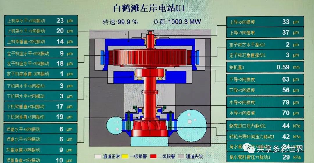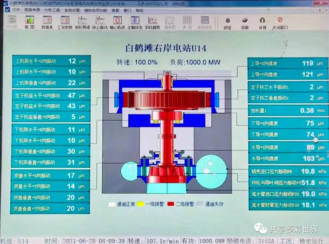 此為2021年6月28日8時09分39秒時,實時顯示的第14號機組發電運行狀況的實時監測畫麵,表明發電機組的性能與1號機組一樣非常良好。當時機組處於額定工況安全正常運行,發出的功率為1000MW(一百萬千瓦)。白鶴灘水電站建成投產後,每年可節約標煤約1968萬噸,減少排放二氧化碳5160萬噸、二氧化硫17萬噸、氮氧化物約15萬噸,節能減排效益顯著。