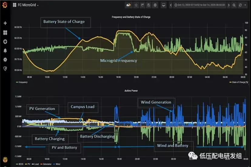 Koralewicz 和 Flatirons Campus的其他幾位研究人員最初使用儲能電池和太陽能陣列黑啟動該站點,不久之後連接了風能,總發電量約為 2 MW,他們的控製方法因其簡單性和可擴展性而獨一無二:不是讓中央控製器向太陽能和風能資產發出命令,而是對每個設備進行獨立編程以產生一種自組織穩定性, 實際結果如下圖所示