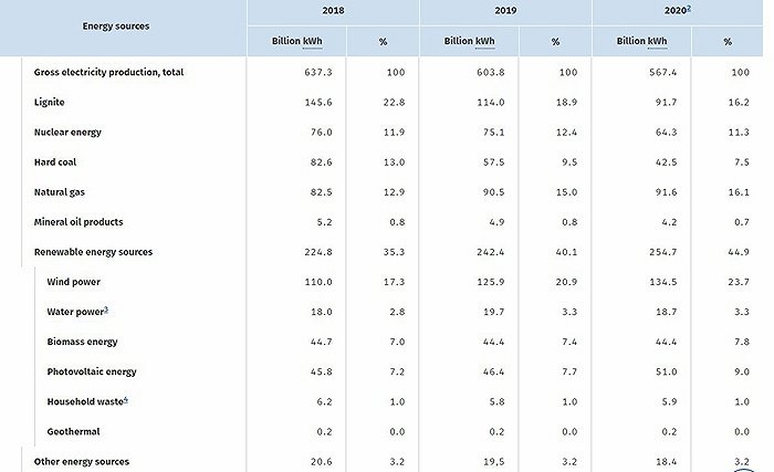 煤炭和核能都曾是德國的主要電力來源,但2020年,該國有44.9%電力來自風能、太陽能等可再生能源。褐煤僅提供16.2%電力,天然氣16.1%,核能11.3%。