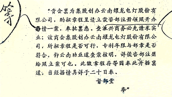 “貴會稟為集股創辦雲南耀龍電燈股份有限公司,酌擬章程呈請立案谘部注冊領照開辦等情一案, 奉批稟悉。查振興商務必先請求實業;該商會集股創辦雲南耀龍電燈股份有限公司,所擬章程是否可行,專利年限與部章是