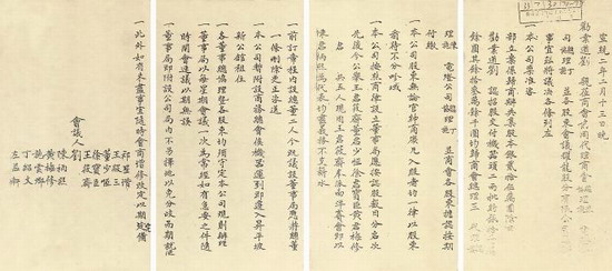 —— 本公司稟準谘部立案,係歸商辦,共集股本銀25萬元,除由勸業道劉岑舫認招股交付機器頭二兩批約銀11 萬餘元,其餘13 萬餘千元均歸商會總理王筱齋,代理總協理陳柄熙、施雲卿,電燈公司總協理丁紹文、施雲卿,並商會各股東擔認,按期付款。