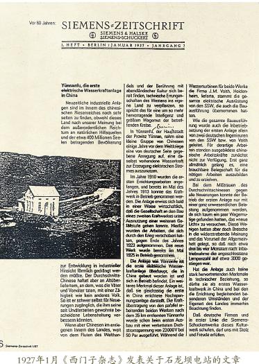 1 月,德國《西門子》雜誌第7 卷第1 期,發表了有關雲南石龍壩電站建設的一篇文章《雲 南府·中國第一個水電站》,文中寫道: “在中國這個大國的內地,還很少能夠找到現代工業設施。但是,我們認為,由於它有 著極為豐富的自然資源和四億人口,工業的發展必然會得到認真考慮。