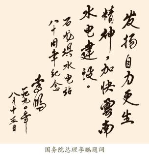 5月12日,中國 社科院院長、著名經 濟學家於光遠考察石 龍壩電站並題詞:“要 發展我國博物館事 業,把博物館與旅遊 和教育事業結合起來,讓寶貴的曆史文物為當前的社會主義現 代化做出貢獻”;“把石龍壩水電站建設成既能生產,又能展覽 我國水電事業發展曆史的地方。”