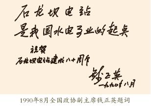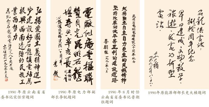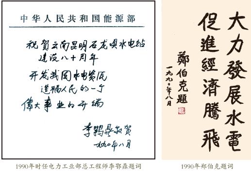 為紀念中國第一座水電站——石龍壩發電廠 建成八十周年,國務院總理李鵬題詞:“發揚自 力更生精神,加快雲南188體育官網app ”。中顧委委員 宋任窮題詞:“弘揚愛國主義精神,進一步建設 好石龍壩發電廠,為振興西南邊陲的民族工業而 努力”。全國政協副主席、前水電部部長錢正英 題詞:“石龍壩發電廠 是我國水電事業的起 點”。 電力部部長史 大楨題詞:“早日建成 文物、教學、旅遊、 發電的新型電站”。中 共雲南省委書記普朝 柱題詞:“ 發揚獨立 自主,自力更生的民 族精神,堅持改革開 放平等互利的建設道路”。雲南省省長和誌 強題詞:“民族工業的 驕傲,188體育官網app 的先 驅”。原中共雲南省工 委書記鄭伯克題詞: “大力發展水電,促進 經濟騰飛”。西門子公 司駐魯布革總代表巴 特題詞:“石龍壩是中 國水電站的先驅,雲 南省和西門子公司合 作的成功典範”。