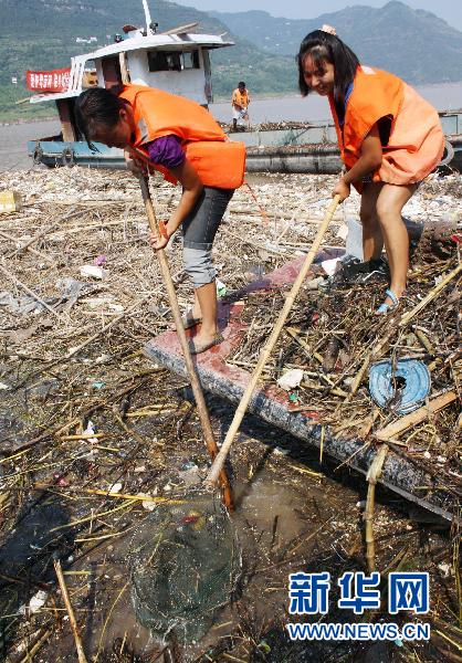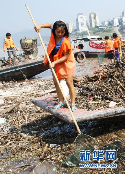 8月5日,陳君在三峽庫區清漂。近日,三峽庫區正在抓緊時機清理打撈洪峰帶來的漂浮物,為汛期三峽水庫的生態保持和出入平安營造良好環境。在重慶市雲陽縣的水上環衛工作隊裏,有一名普通質樸的女青年,她的名字叫陳君,28歲,是雲陽雙江街道一位漁民的妻子,也是“雲陽女子清漂隊”的一員。三峽蓄水以來,她先後參加過3次蓄水、4次汛期抗洪清漂,累計打撈漂浮物上千噸,她用柔弱之軀書寫剛陽之美,抹去三峽的汙垢,換來碧波。新華社發(饒國君 攝)