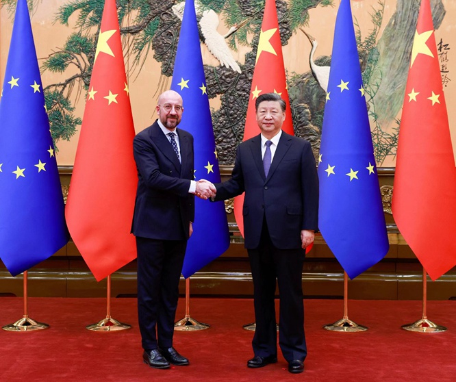 12月1日上午,習近平主席在人民大會堂同歐洲理事會主席米歇爾舉行會談。會談中,習主席強調了中歐關係的世界意義,給出當前應對“世界之變、時代之變、曆史之變”的中國答案,並就中歐關係發展提出四點看法。