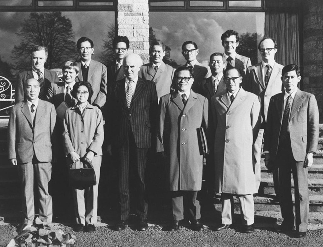 1964年6月,江澤民同誌(二排右一)在法國艾克斯萊班出席國際電工委員會會議期間同與會代表合影。新華社發