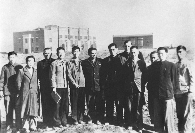 1956年,江澤民同誌(左七)在長春第一汽車製造廠同援建一汽的蘇聯專家等合影。新華社發