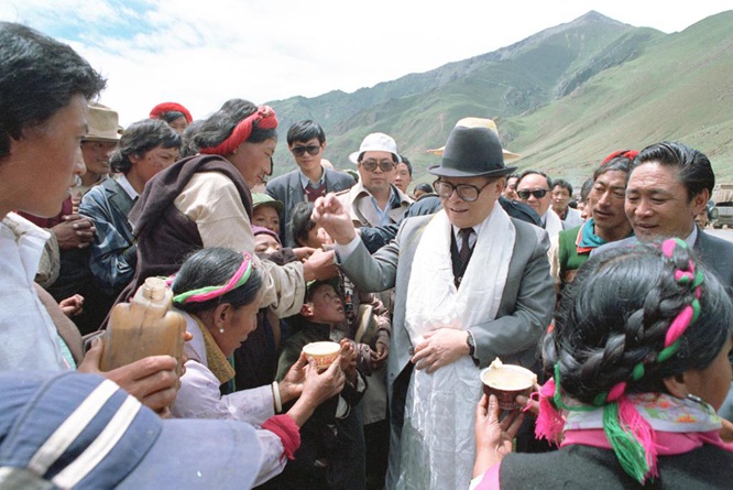 1990年7月25日,江澤民同誌與藏族群眾共慶望果節。新華社發