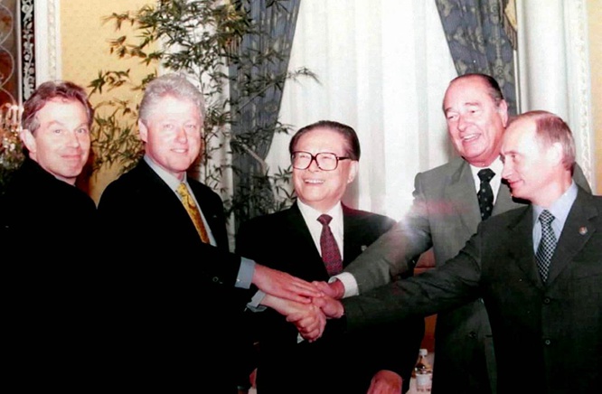 2000年9月7日,由中國倡議的聯合國安理會五個常任理事國首腦會議在紐約舉行。江澤民同誌(中)同法國總統希拉克(右二)、俄羅斯總統普京(右一)、英國首相布萊爾(左一)、美國總統克林頓(左二)握手合影。新華社發
