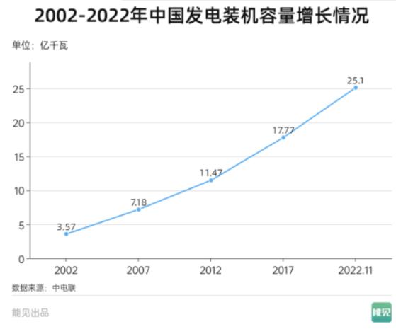 中國發電裝機容量駛入增長快軌。2002年底我國發電裝機容量僅有3.57億千瓦,截至2022年11月底這一指標已飆升至25.1億千瓦。其中2013年中國就以12.58億千瓦的裝機容量,超越美國升至世界第一,並不斷擴大優勢至今。