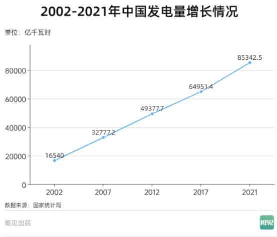 中國發電量也隨之進入高速增長通道。2002年我國發電量僅有16540億千瓦時,2021年這一指標飆升至85342.5億千瓦時。其中2011年中國就以47001億千瓦時的發電量,超過美國躍居世界第一,優勢保持至今並不斷擴大。