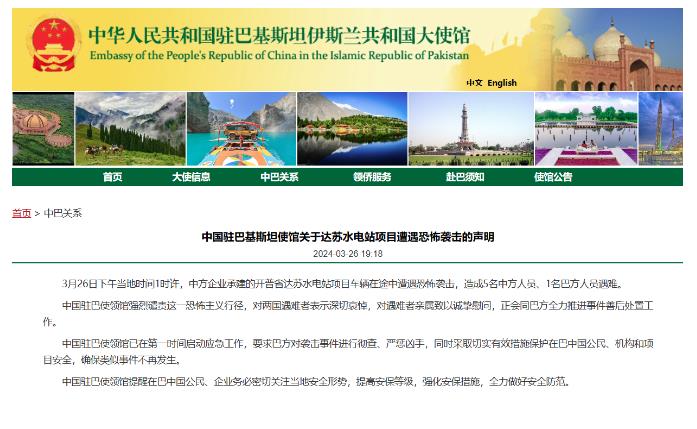 3月26日下午當地時間1時許,中方企業承建的開普省達蘇水電站項目車輛在途中遭遇恐怖襲擊,造成5名中方人員、1名巴方人員遇難。