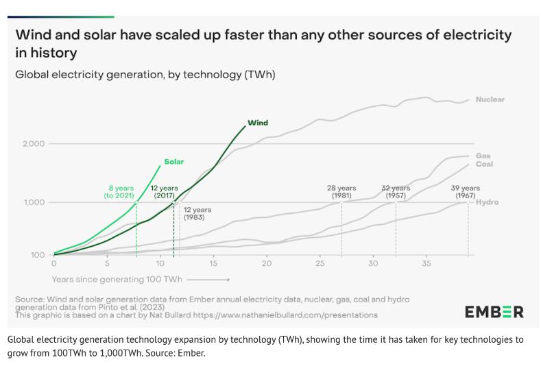 根據智庫Ember的最新報告分析,在全球範圍內風能和太陽能的增長速度比曆史上任何其他電力來源都快。太陽能和風能從每年100太瓦時增長到1000太瓦時,分別隻花了8年和12年的時間。同樣是100太瓦時到1000太瓦時,天然氣電廠花了28年、煤電化了32年、水電花了39年。