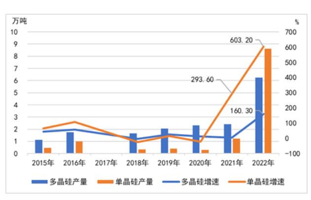 圖3 青海單晶矽、多晶矽年產量及同比增速