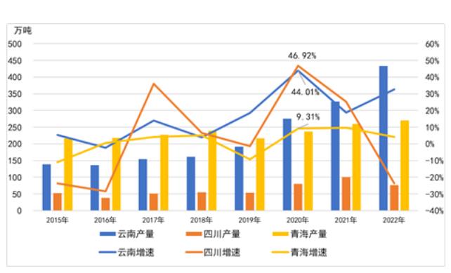 圖2 雲南、四川、青海電解鋁年產量及同比增速