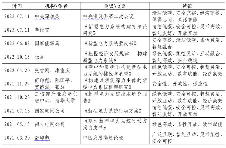 表1 2021年以來關於新型電力係統特征的定義