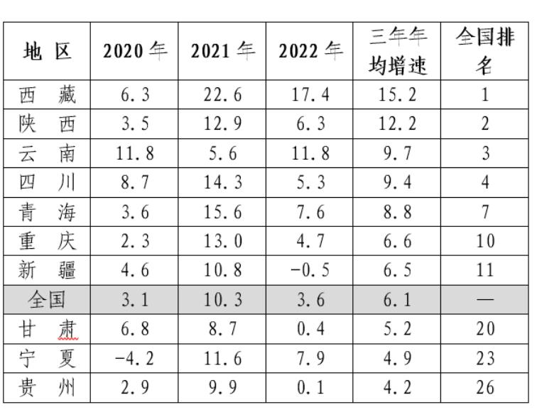 新時代西部大開發戰略推進,有力促進西部經濟增長。2020年黨中央、國務院印發的《關於新時代推進西部大開發形成新格局的指導意見》和2022年工信部、國家發改委等十部門印發的《關於促進製造業有序轉移的指導意見》,均提出“支持符合環保、能效等標準要求的高載能行業向西部清潔能源優勢地區集中。”2020年1月,中央確定成渝地區雙城經濟圈國家戰略,在西部地區形成高質量發展的重要增長極。2022年,“東數西算”工程啟動,成渝、貴州、甘肅、寧夏等8地啟動建設國家算力樞紐節點。一係列政策為西部地區經濟增長注入新動力,我國區域經濟增長和用電量增長格局呈現“西快東慢”態勢。過去三年全國全社會用電量年均增速為6.1%(表3),西藏(15.2%)、陝西(12.2%)、雲南(9.7%)和四川(9.4%)位列增速前4位,青海(8.8%)、重慶(6.6%)和新疆(6.5%)也高於全國水平。