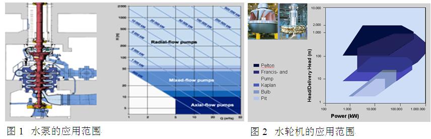 基於三維納維爾-斯托克斯仿真方法的流體動力學分析的廣泛應用以及計算方法的發展進步,實現了高效地分析整個水力機械包括從蝸殼進口到尾水管出口的流動,對機組進行用戶個性化定製設計和最優化方案設計成為可能。這樣的設計方法與30年前的設計方法相比較,可以獲得性能上的極大改善,以及對運行情況的預測。圖1和圖2分別為不同類型的水泵和水輪機的適用範圍;圖3通過一部分福伊特西門子水電在近幾十年內提供的主要水電機組展示了機組出力的發展曆程。