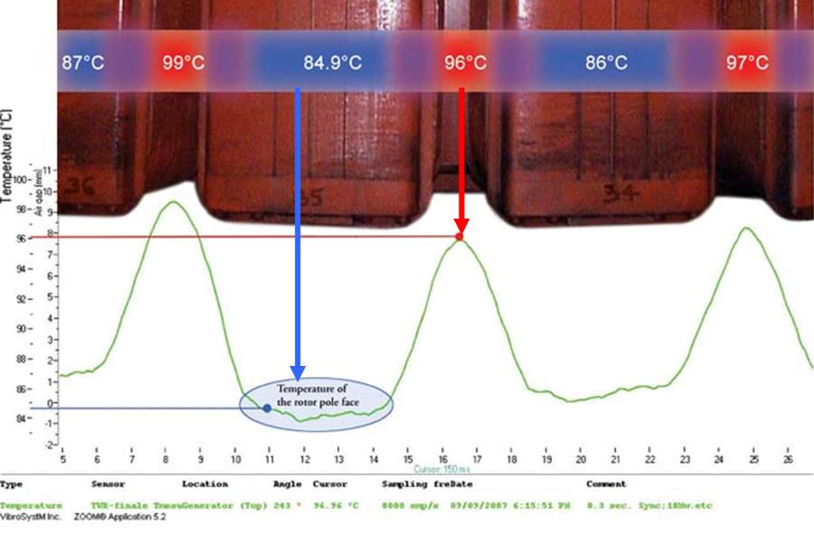 試驗結果表明,不僅是有可能在每秒120個磁極掠過傳感器時, 獲得整個磁極表麵溫度的精確測量數據,而且可以讀取準確的線圈溫度。見圖4