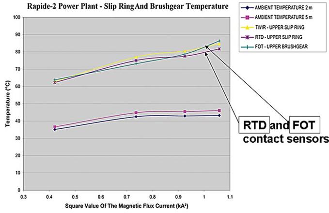 溫度仍然是發電機檢修所需要的一個關鍵參數。 “ 碳刷的問題往往和工況有關,如過熱[…]"3 。過熱一般是各種問題的症狀。其他因素,阻抗增加,過流,和碳刷-滑環接觸不當會導致過熱。如何解決這個問題促使電廠研究故障的其他產生原因,包括勵磁的調控, 從而避免不良後果,如事故停機或者發電機過早損壞。所以滑環和碳刷溫度實時監測 提供了永久,可靠, 而且-更重要的是-一個有用的手段,幫助電廠人員有效安全地運行發電機。在Rapide-2水電站取得的成果得到魁北克電力公司的肯定, 魁北克電力公司決定進行進一步的測試,並啟動了一個試點項目,旨在評估勵磁機的溫度測量效率。魁北克電力公司的目標是通過這一項目,在其他下屬電廠(總發電容量35 000兆瓦)全麵推廣該項技術, 以防止發電機的過熱問題,避免火災意外並事故停機。
