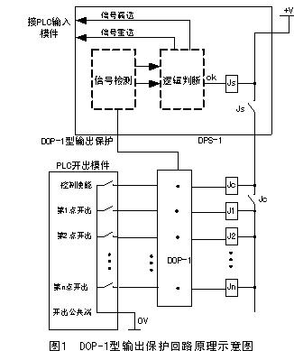 DOP-1型輸出保護實際上是由信號檢測部分、邏輯比較判斷部分和繼電器輸出閉鎖部分組成,這些部分是由硬件電路構成,不受PLC的程序和開出模件狀態的影響。如果開出模件的信號輸出狀態不符合DOP-1型輸出保護設置的條件,則其內置的閉鎖繼電器將起作用,從而切斷開出中間繼電器的電源回路。一個完整的DOP-1型輸出保護回路由開出保護盒DOP-1和開出重漏選判斷盒DPS-1兩部分組成,其原理如圖1所示: