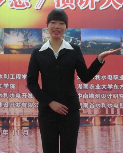 大家上午好!我是湖南水利水電職業技術學院11級水利工程係李芳華。懷著萬分激動的心情站在這裏的我,今天作為參賽選手,為大家帶來的演講題目是《踮起夢想的腳尖》。
