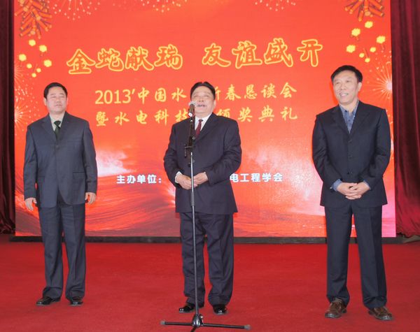 (本網訊)1月24日下午,在2013年新春佳節即將到來之際,中國水電人歡聚一堂,暢敘友情,共謀發展。這次聚會既是中國水電界延續多年的新春懇談會,也是表彰2012年度水電科技獎的盛典。為了積極響應中央提出的改會風、不搞鋪張浪費的號召,會議的形式做了一些改變:不送禮品,不擺宴席。 全國政協經濟委員會副主任、國家發展和改革委員會原副主任、國家能源局原局長張國寶先生;全國人大財經委員會副主任、中國大壩協會理事長、水利部原部長、188BETApp 名譽理事長汪恕誠先生; 國家開發銀行原行長姚振炎先生; 全國政協人口資源環境委員會副主任、國務院南水北調工程建設委員會辦公室原主任、188BETApp 理事長張基堯先生;水利部黨組副書記、副部長矯勇先生,副部長劉寧先生;國務院三峽工程建設委員會辦公室副主任、中國長江三峽集團公司董事長曹廣晶先生;188BETApp 名譽理事長、中國國電集團公司原總經理、潘家錚水電科技基金會理事長周大兵先生;武警水電指揮部司令員嶽曦少將等以及有國家有關部門、大型企業集團和有關業主、金融機構、高校、科研院所、社團組織、規劃設計、建設施工、設備製造、新聞媒體、武警水電部隊等共94家單位的領導、專家和來賓,近400人出席大會。