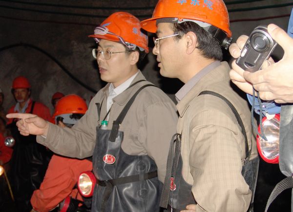圖:張春生(左)等深入錦屏二級水電站輔助洞進行現場查勘
